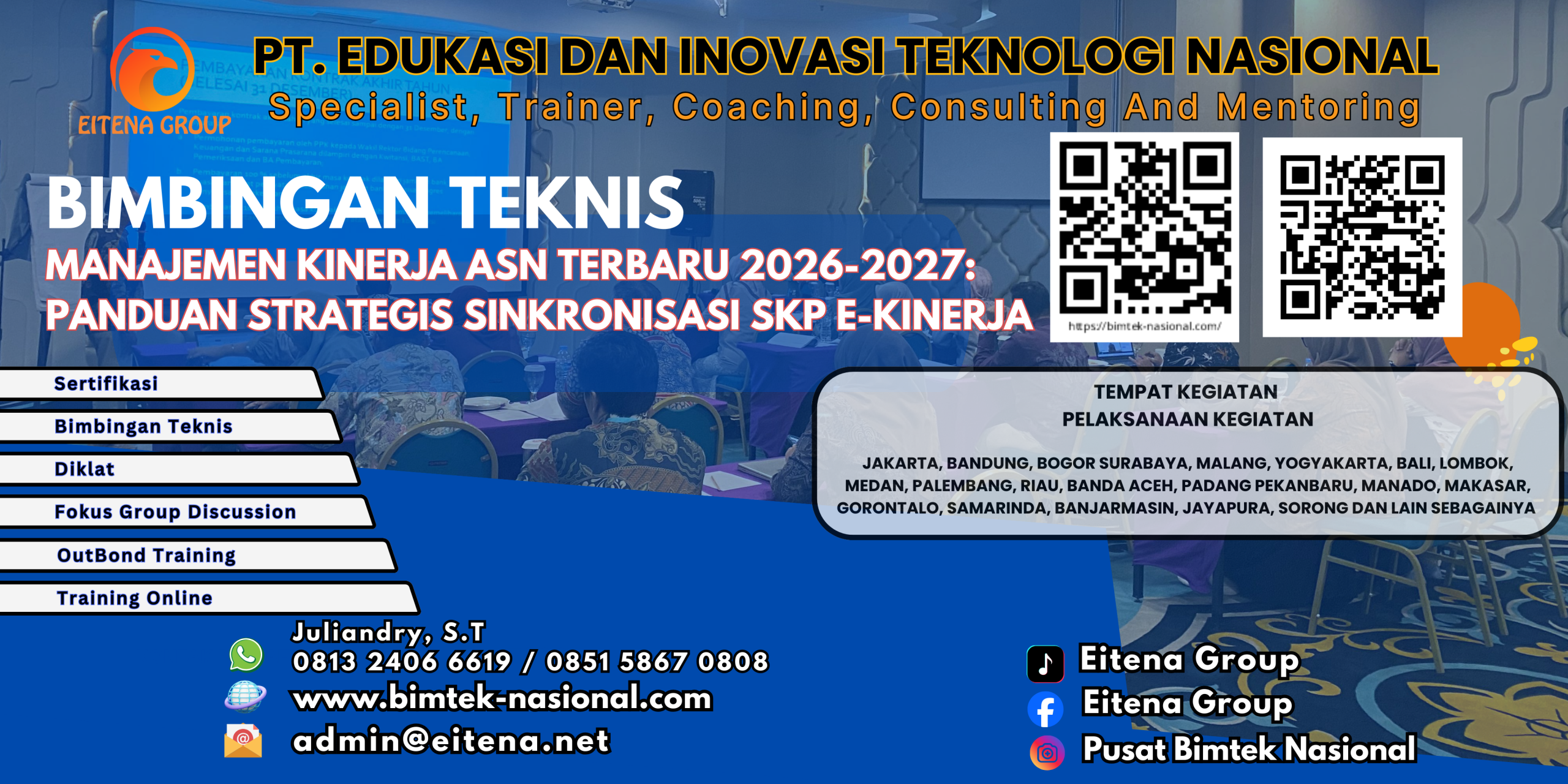 Sehubungan dengan upaya peningkatan pemahaman, kapasitas, serta kapabilitas Pemerintah Pusat, Pemerintah Daerah, dan sektor Swasta dalam mendukung pembangunan dan tata kelola kelembagaan, kami dari Edukasi dan Inovasi Teknologi Nasional ( Eitena Group ) mengundang Bapak/Ibu/Saudara(i) Untuk Mengikuti Bimbingan Teknis Dengan Tema: Bimtek Manajemen Kinerja ASN Terbaru 2026-2027: Panduan Strategis Sinkronisasi SKP e-Kinerja.