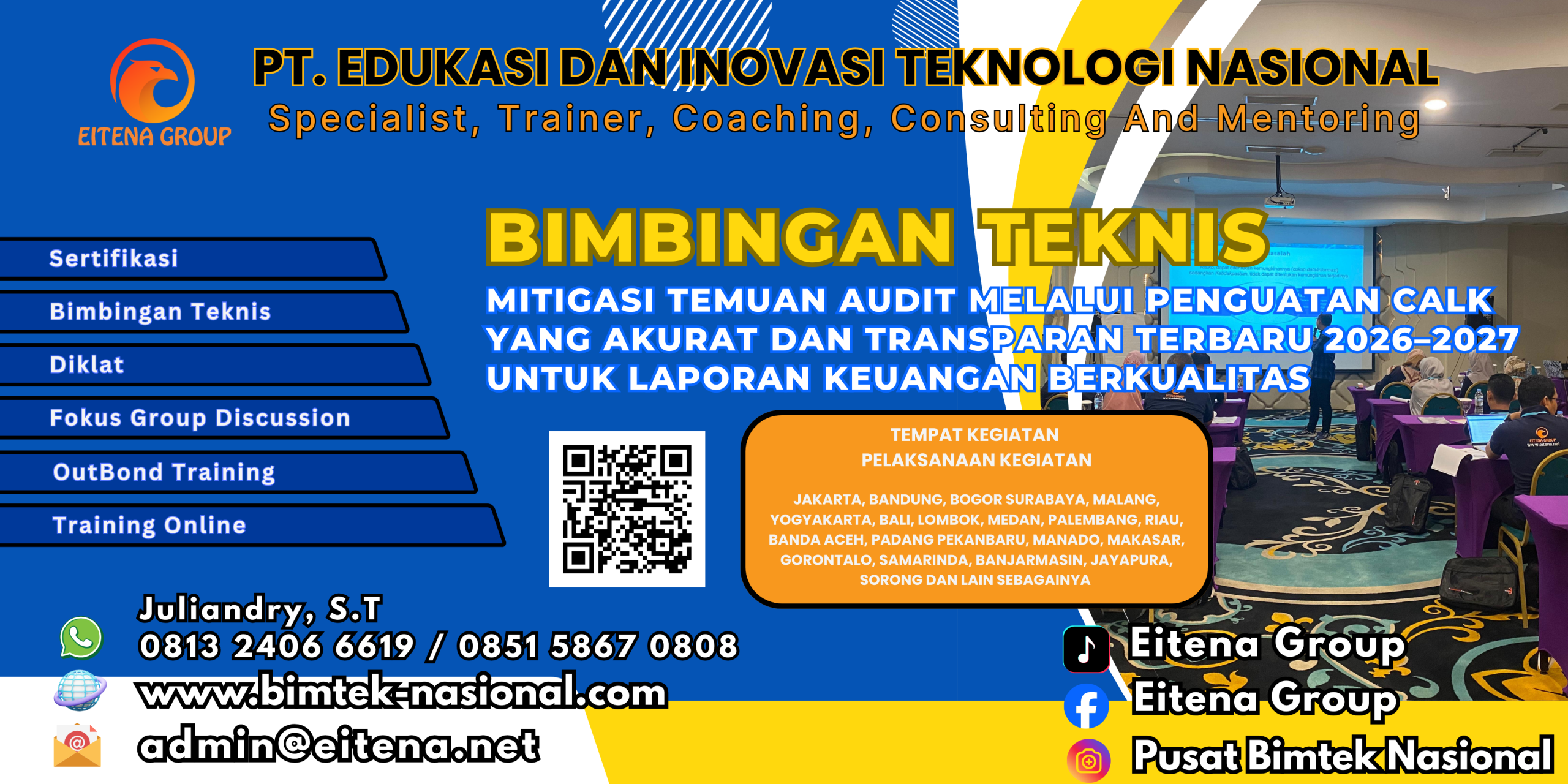 Sehubungan dengan upaya peningkatan pemahaman, kapasitas, serta kapabilitas Pemerintah Pusat, Pemerintah Daerah, dan sektor Swasta dalam mendukung pembangunan dan tata kelola kelembagaan, kami dari Edukasi dan Inovasi Teknologi Nasional (Eitena Group) mengundang Bapak/Ibu/Saudara(i) Untuk Mengikuti Bimbingan Teknis Dengan Tema: Bimtek Mitigasi Temuan Audit melalui Penguatan CaLK yang Akurat dan Transparan Terbaru 2026–2027 untuk Laporan Keuangan Berkualitas.
