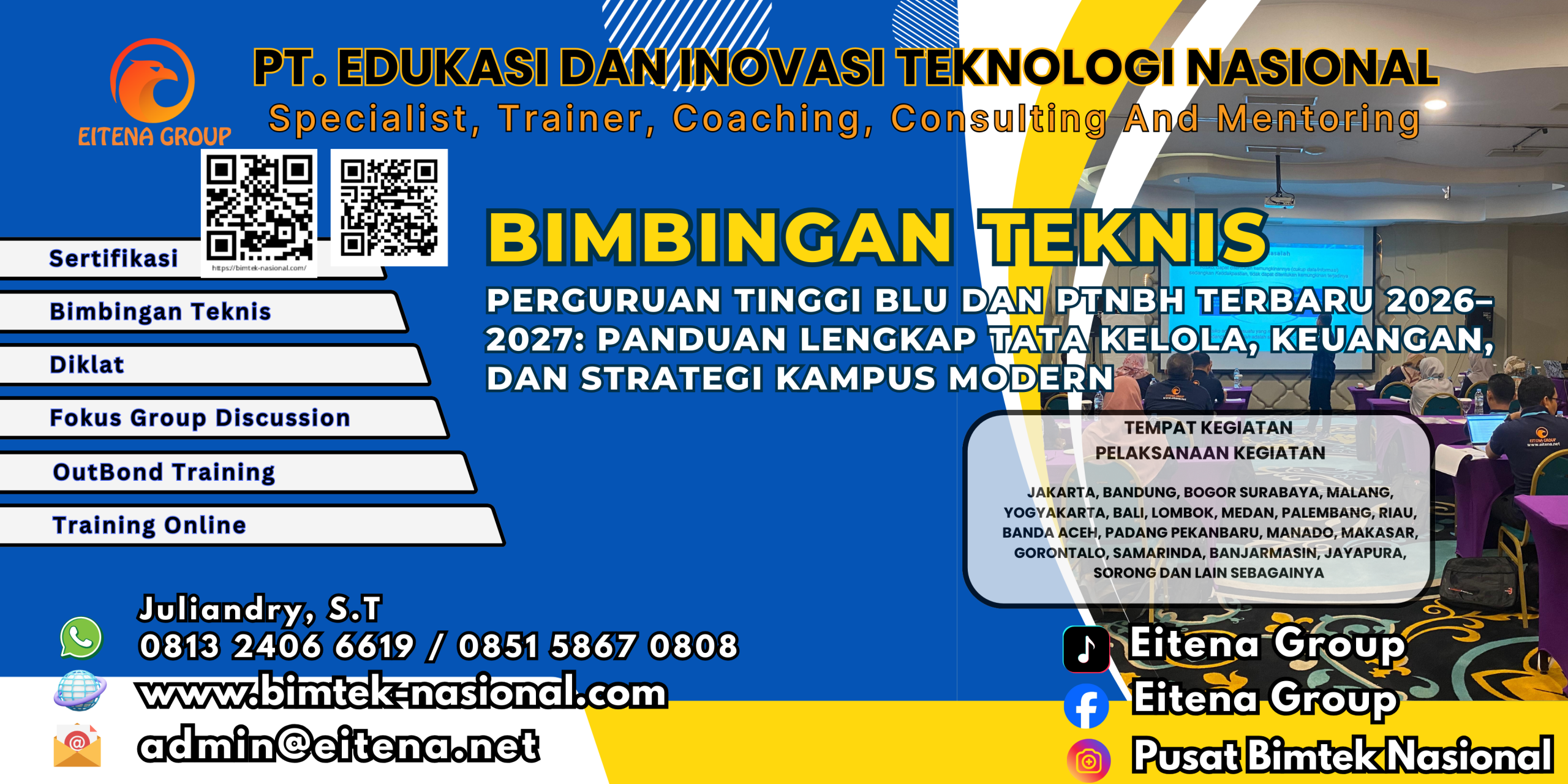 Sehubungan dengan upaya peningkatan pemahaman, kapasitas, serta kapabilitas Pemerintah Pusat, Pemerintah Daerah, dan sektor Swasta dalam mendukung pembangunan dan tata kelola kelembagaan, kami dari Eitena Group mengundang Bapak/Ibu/Saudara(i) Untuk Mengikuti Bimbingan Teknis Dengan Tema: Bimtek Perguruan Tinggi BLU dan PTNBH Terbaru 2026–2027: Panduan Lengkap Tata Kelola, Keuangan, dan Strategi Kampus Modern.