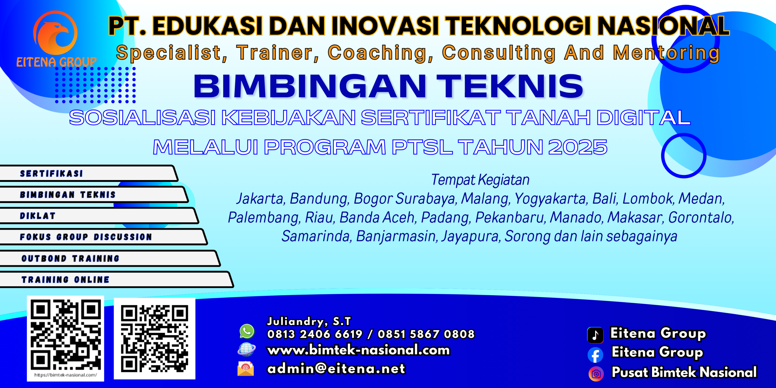 Sehubungan hal tersebut kami dari Edukasi dan Inovasi Teknologi Nasional Selaku penyelenggara kegiatan serta dukungan narasumber yang berkompeten dibidangnya, Mengundang Bapak/Ibu untuk mengikuti kegiatan ”Bimtek Sosialisasi Kebijakan Sertifikat Tanah Digital melalui Program PTSL Tahun 2025″ untuk pendaftaran silahkan menghubungi kami.